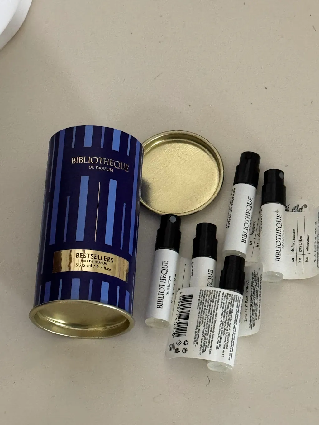 The set includes a discovery format of 5 warm and addictive fragrances from Bibliotheque de Parfum: