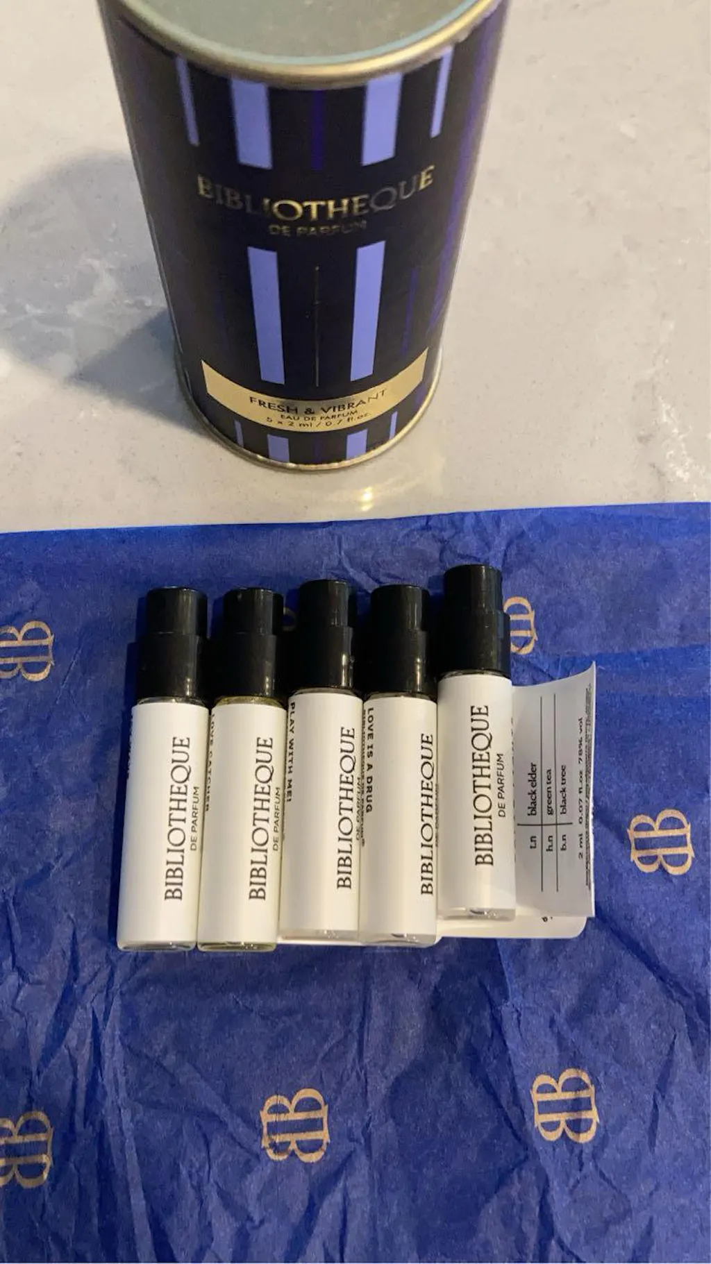 The set includes a discovery format of 5 fresh and vibrant fragrances from Bibliotheque de Parfum: